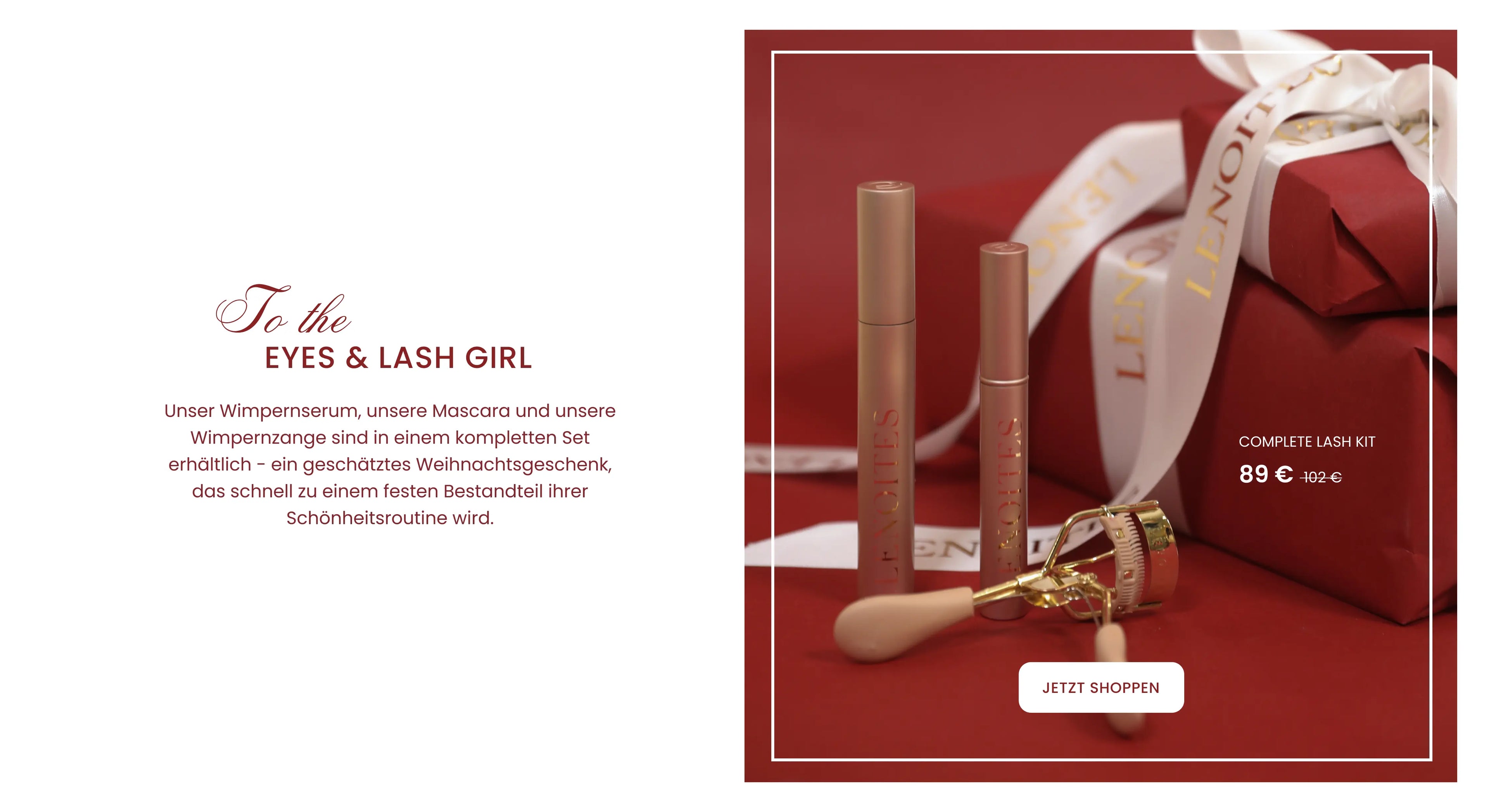 Weihnachten ist mehr als nur Geschenke unter dem Baum. Es geht darum, etwas zu schenken, das wirklich berührt – ein Geschenk, das ein Lächeln ins Gesicht zaubert, Teil des Alltags wird und jeden Moment ein wenig Freude schenkt. In unserem Geschenkguide finden Sie alles von seidig pflegenden und schützenden Haarprodukten über Wimpernseren für Länge und Volumen bis hin zu zeitlosen Accessoires, die den Alltag in luxuriöse Momente verwandeln. Ein Geschenk von Lenoites ist mehr als nur ein Präsent – es ist Selbstvertrauen, Wohlbefinden und Schönheit, die Sie immer wieder aufs Neue begeistern werden.