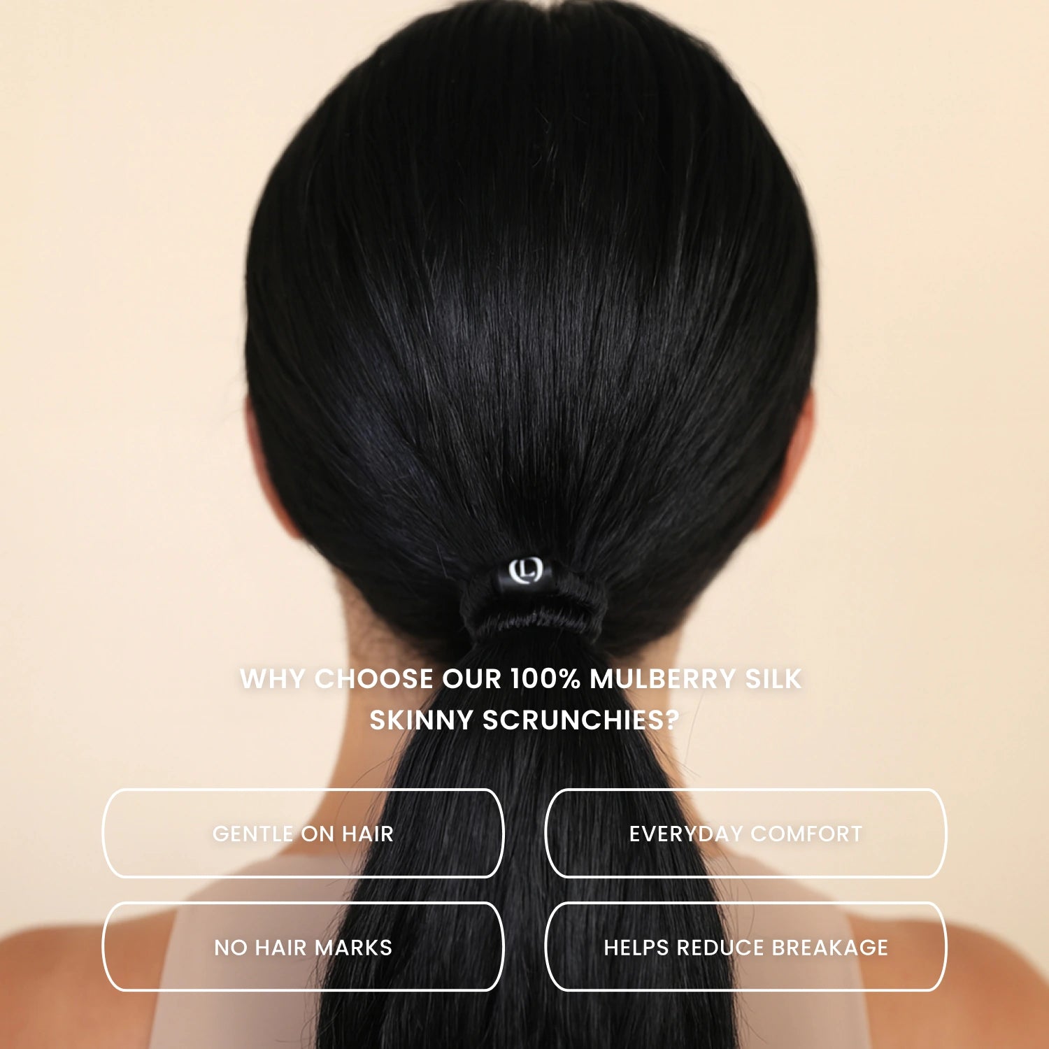 Beautiful and timeless scrunchies made of 100% mulberry silk with a weight of 22 momme, which is a measure of the quality and thickness of the silk. A piece of jewelry for the hair without rubbing the outer layer, which promotes healthy hair. Prevents marks and imprints during updos.