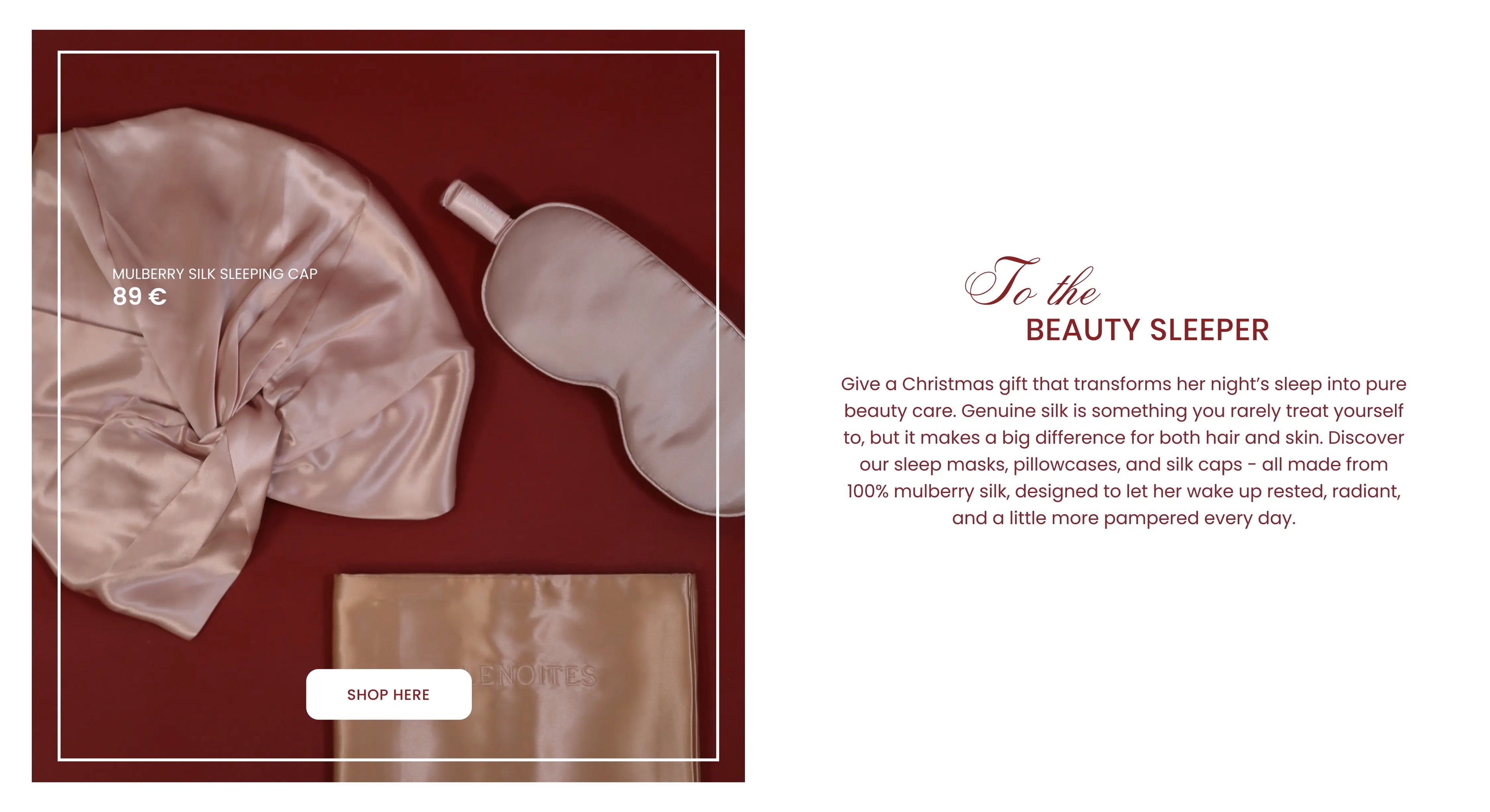 Schenke ein Weihnachtsgeschenk, das ihren Schlaf in reine Schönheitspflege verwandelt. Echte Seide ist etwas, das man sich selten selbst gönnt, aber sie macht einen großen Unterschied für Haar und Haut. Entdecke unsere Schlafmasken, Kissenbezüge und Seidenhauben - alle aus