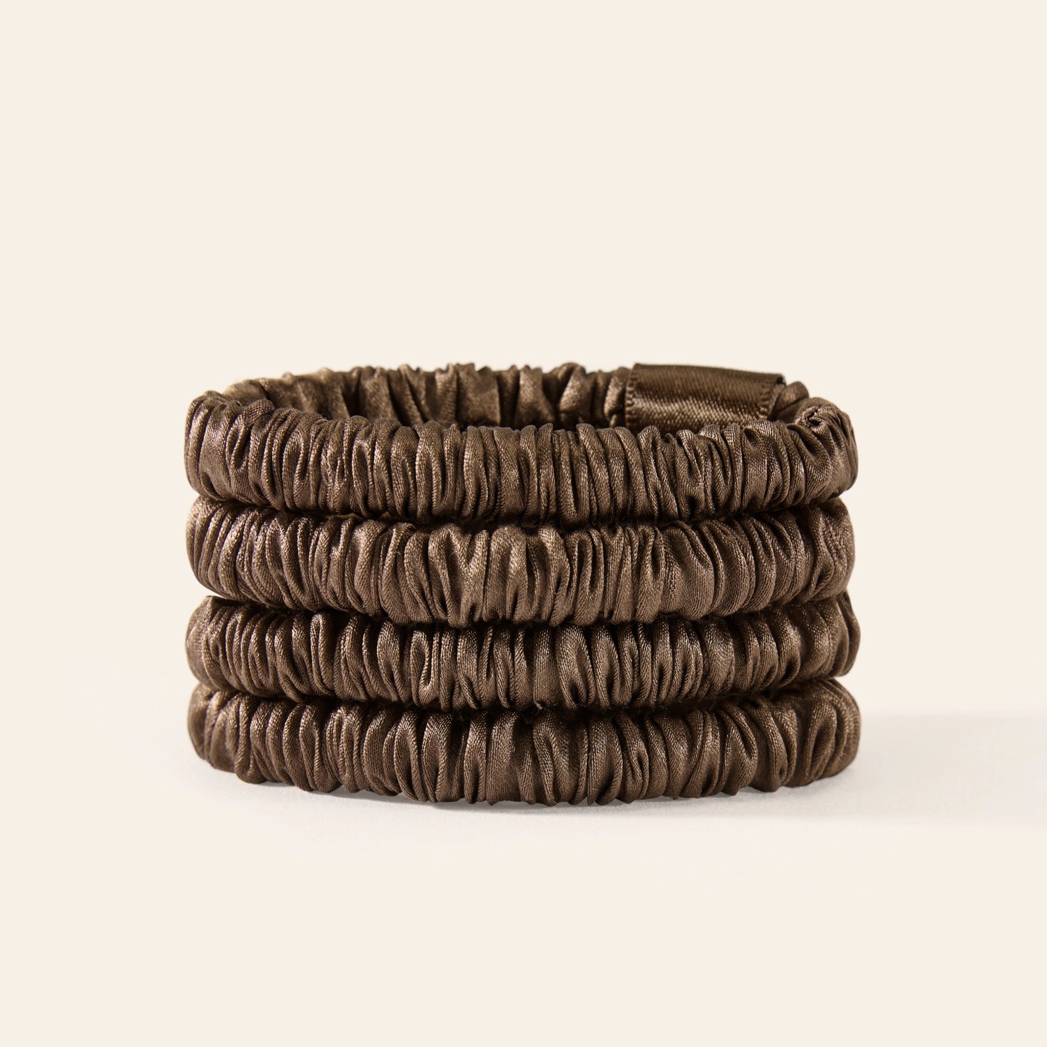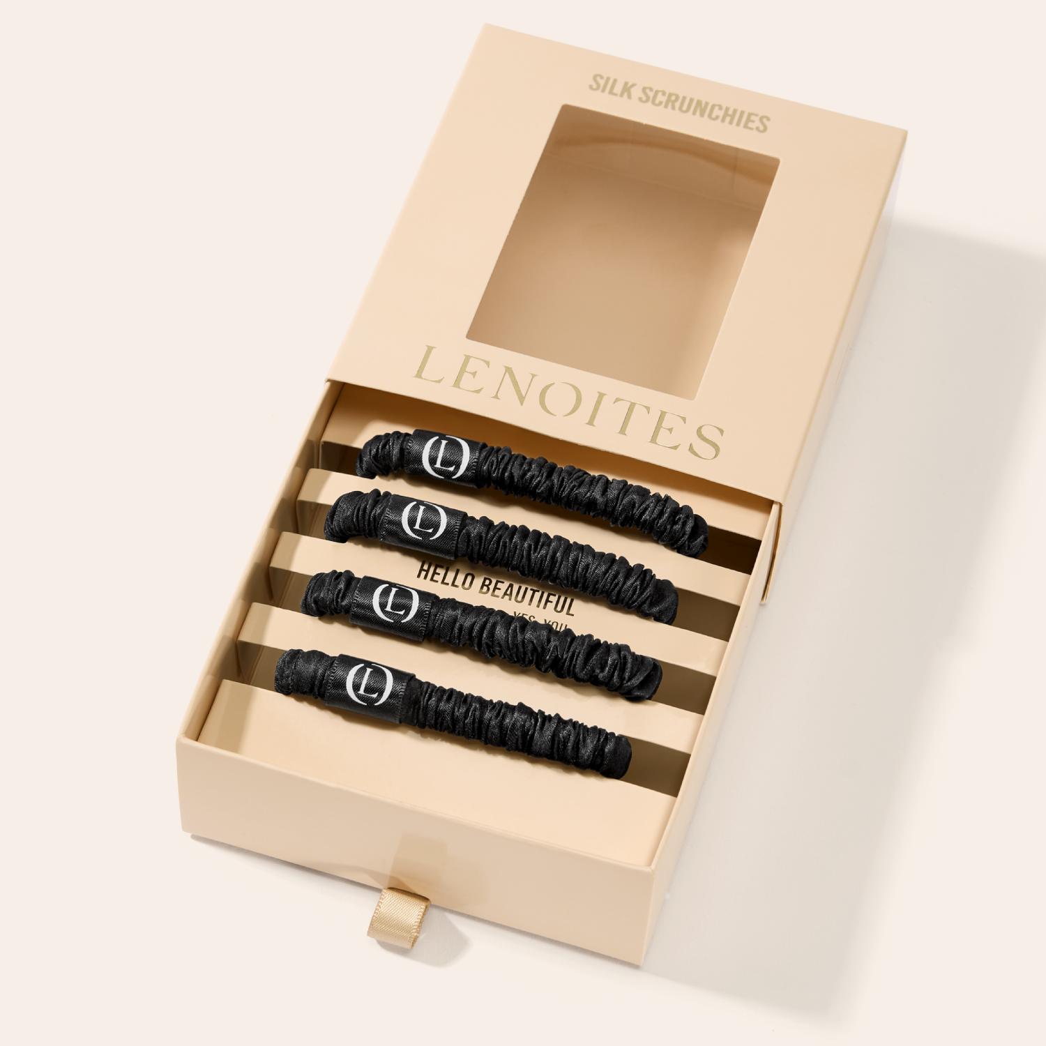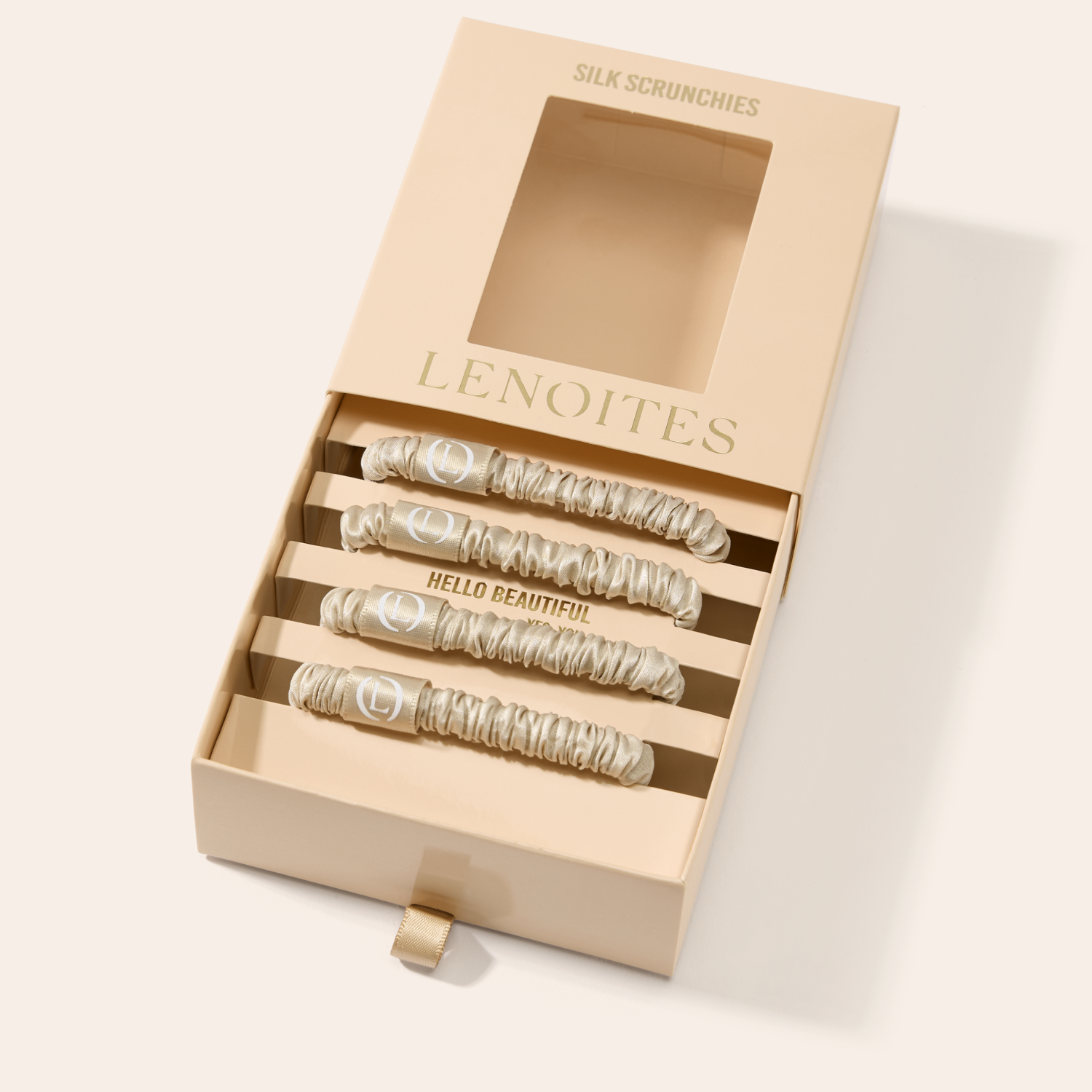 Wunderschöne und zeitlose Scrunchies aus 100 Prozent Maulbeerseide mit einem Gewicht von 22 Momme, ein Maß für die Qualität und Dicke der Seide. Ein Schmuckstück für das Haar, das die äußere Haarschicht nicht reizt und besonders sanft ist. Verhindert Abdrücke und Druckstellen bei Hochsteckfrisuren.